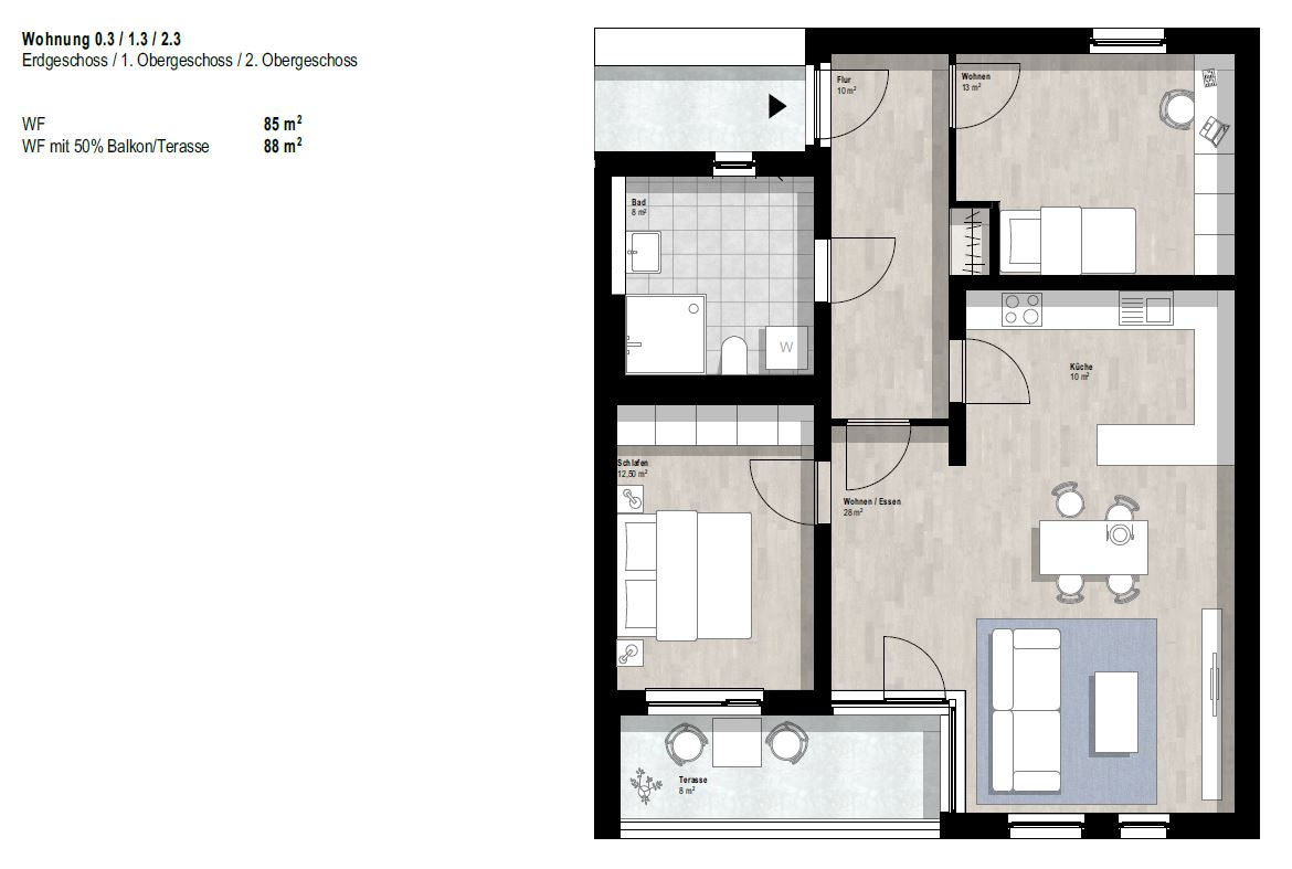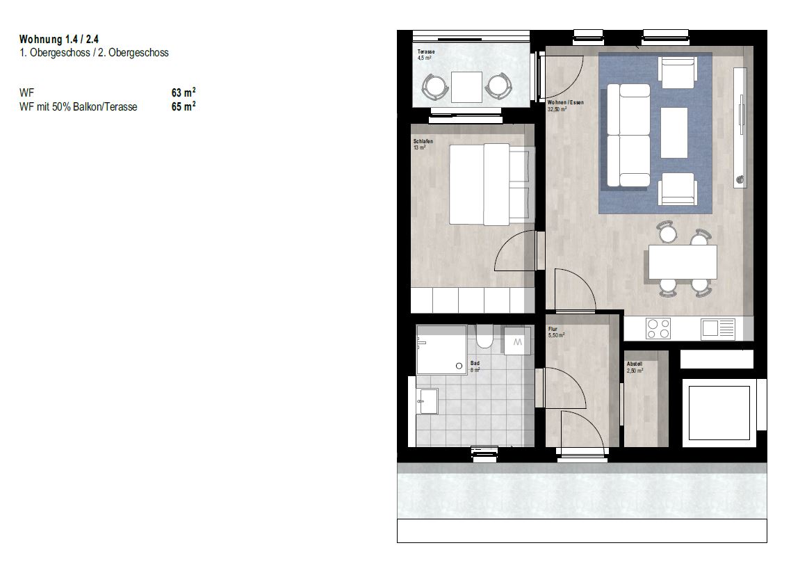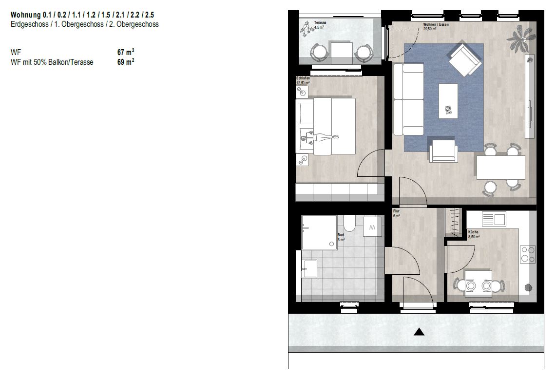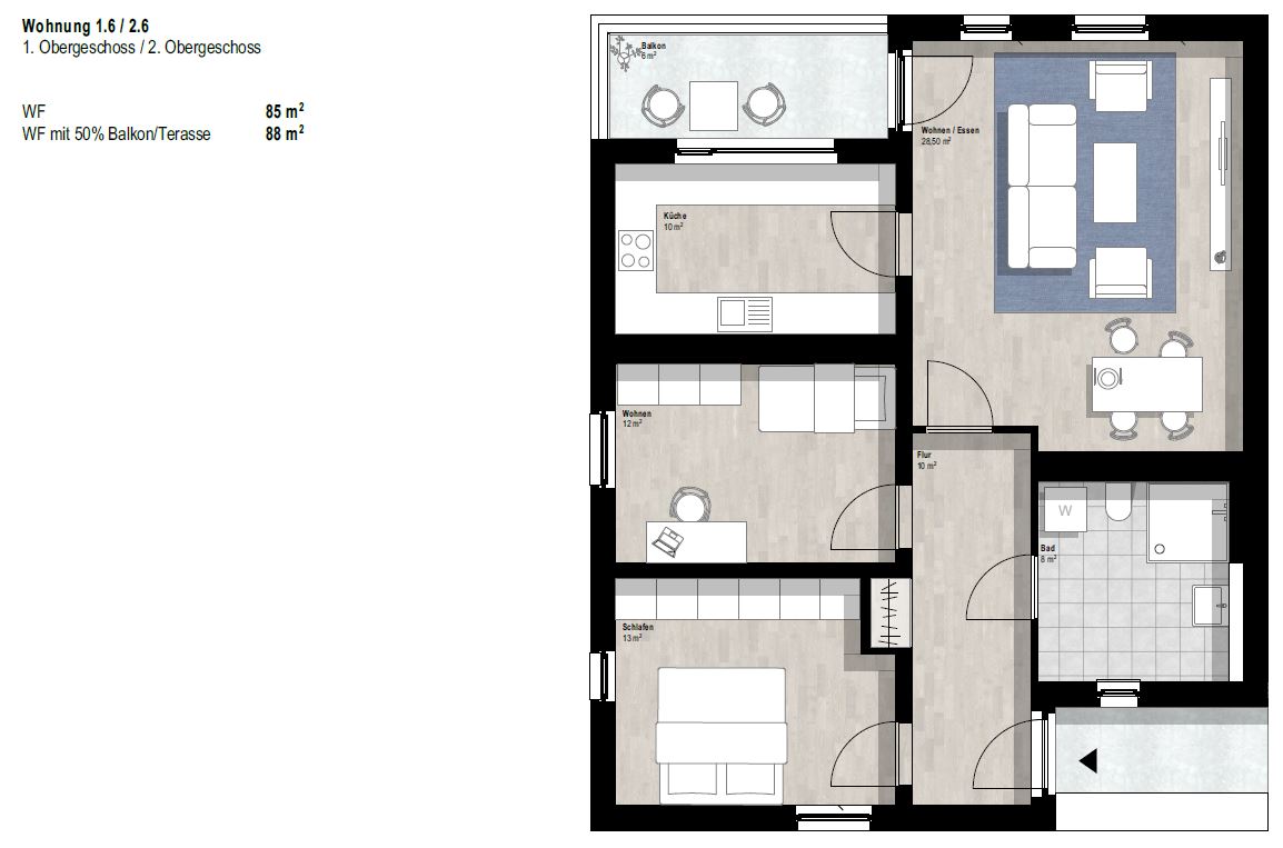 Die Wohnflächen variieren zwischen 60 m² bis 100 m².